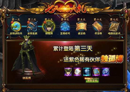 登陆游戏7天,每天都能领取到超值的登陆礼品及礼包,让您欲罢不能。更可获得稀有紫色伙伴“独孤博”,助您封神!