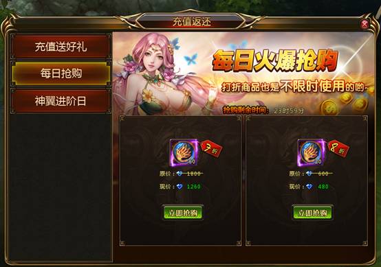 玩家完成首次充值后,即可开启该活动。开启后玩家可连续7天每日免费领取,更可用超低价格抢购稀有物品道具技能书,走过路过,千万别错过!