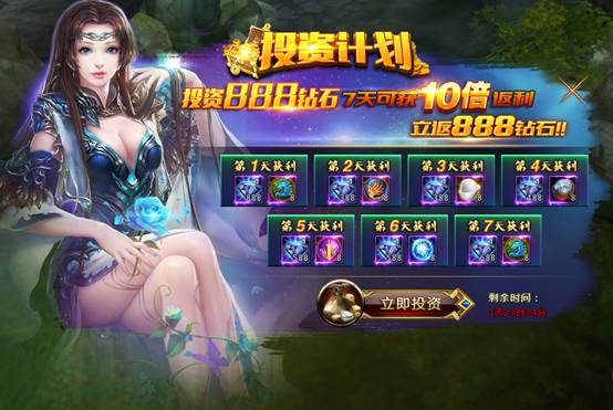 开服前3天,玩家一次性投资888钻石就可以连续7天领取超值回馈,各位玩家千万不能错过。一次投资,10倍返还!