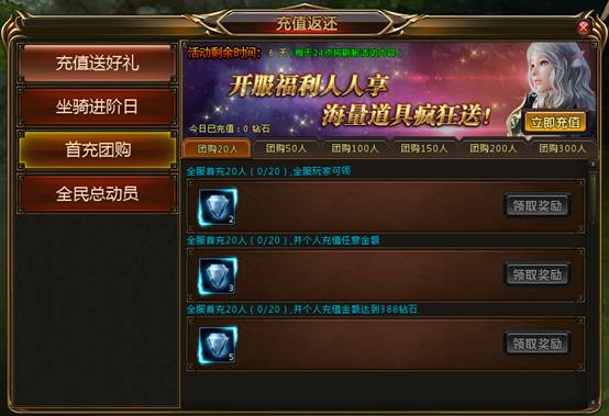 当前服务器累计充值人数达到系统要求,即可领取对应充值人数的首充团购的免费奖励;