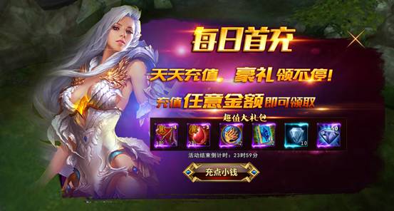 当玩家领取首充奖励之后,将在第二天开启每日首充功能。每日充值任意金额可获得当日首充,活动奖励每天不一样,只需充值任意金额即可获得。