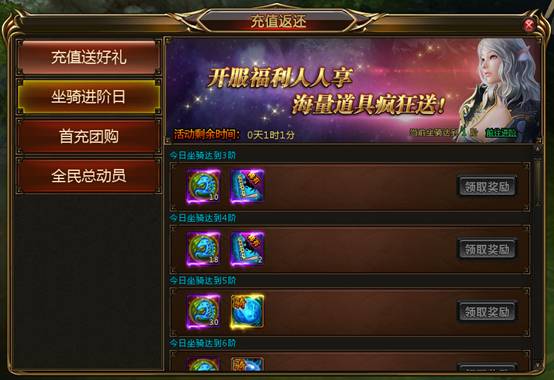 开服第一天即可开启,当玩家对应进阶系统达到对应阶数时,赠送超值好礼。