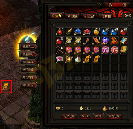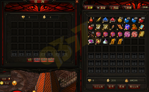 背包满了,可以将暂时不能使用或者不方便携带的装备或道具寄存在仓库。《暗黑屠龙》的一大创新就是——将物品存入仓库可以在背包界面直接完成,无需跑到仓库管理员面前进行;只有从仓库取出物品时,才需要寻找仓库管理员。