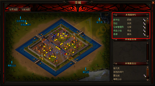 点击右上角的地图按钮【图】或使用快捷键M打开地图界面,在地图界面右上方就是本地图NPC列表。寻找到目标NPC后,点击NPC名字就可以自动寻路,也可以点击名字后面的“传送卷轴”,使用瞬间传送功能。