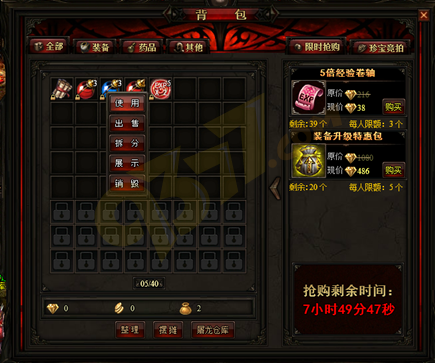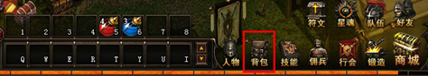 点击屏幕下方快捷图标栏的【背包】图标或按快捷键“B”,打开【背包】界面。将鼠标移到道具栏中的某个物品上,可以通过鼠标双击或者单击在打开的菜单栏中选择使用道具。