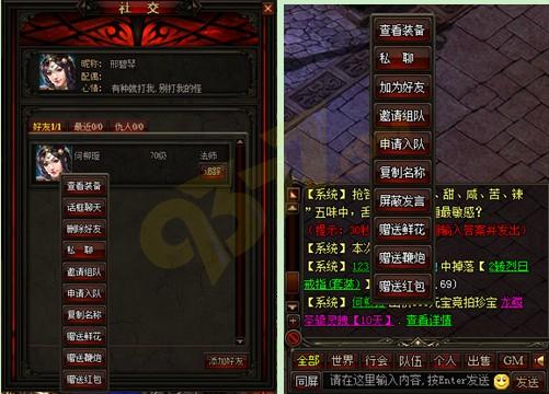 在好友菜单里用鼠标左键点击玩家头像或者在聊天窗口点击玩家的名字,就可以选择聊天、查看装备、组队、送花等功能。
