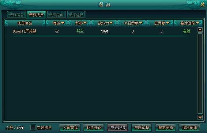 帮派成员:记录了本帮所有成员,在面板内可以进行入帮审批、职务任命、辞去职务、开出成员等操作。