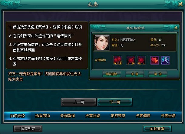 如果已经心有所属,可以点击对方玩家头像【菜单】,选择求婚选项。如果没有定情信物,可点击【购买信物】打开信物商店。点击界面右侧的【求婚】按钮可完成求婚步骤,待对方同意后两人结为夫妻。