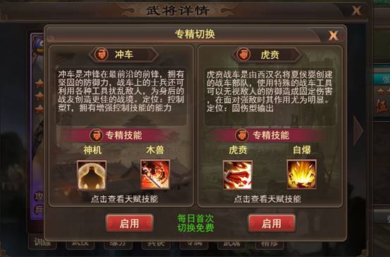 3、专精路线可以切换,专精点互通,切换专精路线消耗元宝,每天每个武将有一次免费切换专精路线。