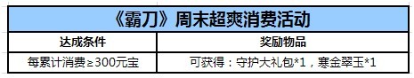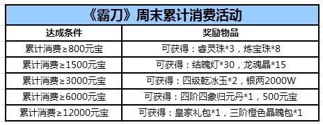活动内容:在活动期间内,游戏屏幕右上方会出现“霸刀福利多”活动图标,玩家可以点击进入查询自己的元宝消费情况,达成条件即可在“霸刀福利多”界面里直接领取相应奖励。