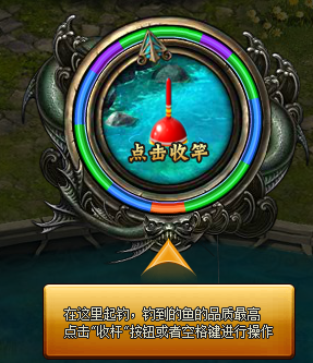 点击“收杆”按钮开始钓鱼玩法,鱼的品质橙>紫>蓝>绿。