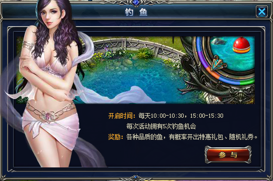 50级可参加钓鱼玩法,每天14:00-14:30,19:30-20:00分别开启2次,每次活动拥有5次钓鱼机会。