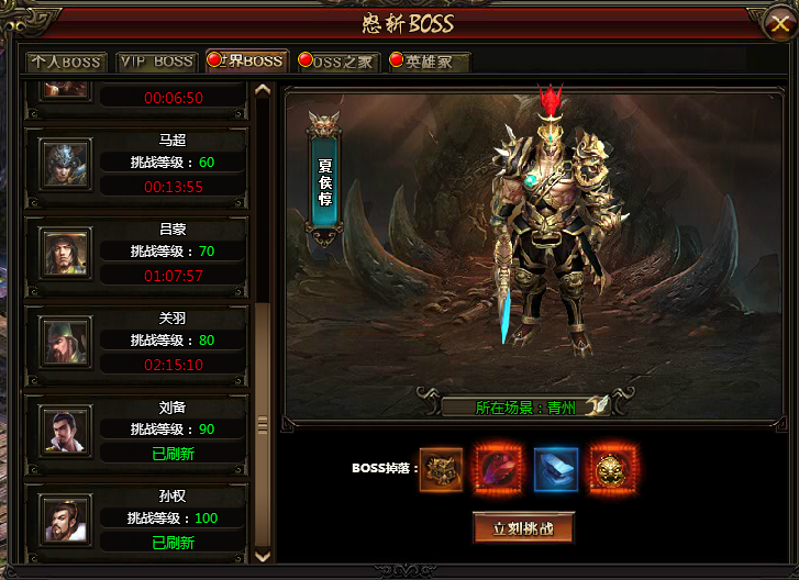 每个个人BOSS都有挑战等级,玩家可根据自身等级前去挑战相应BOSS,每天每个个人BOSS只能挑战1次。