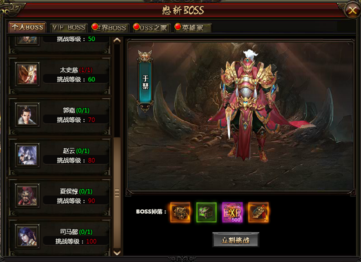 成功挑战VIP BOSS可获得大量经验和坐骑材料,同时还有概率掉落高级装备。