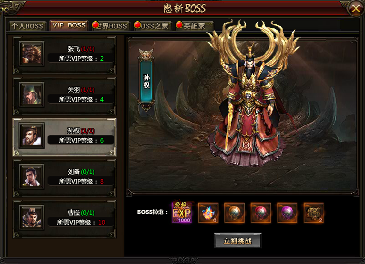 VIP BOSS是专门为VIP玩家准备的,不同的BOSS,需要进入的VIP等级限制不同,玩家可根据自己VIP等级前去挑战相应BOSS。