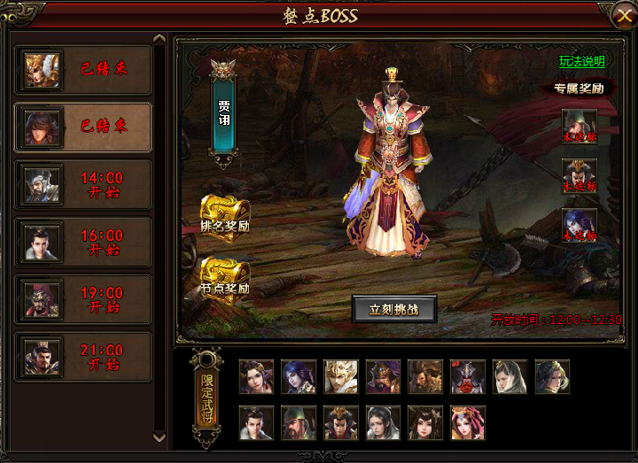 整点BOSS每个整点刷新,每个BOSS都有限定的上阵武将,同时,如果上阵指定的专属武将,伤害达标后,除了获得常规参与奖励,还能获得专属武将奖励。