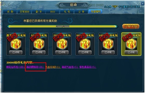 玩家充值后,领取充值礼包,打开充值礼包后获得大量的铜钱。