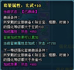 (一)强化:提升装备基础属性,装备的强化的等级分为凡器到青龙递增的10个阶层,每个阶层有10个等级。强化所有装备到一定的等级后,可以获得一个强化套装属性,而且强化套装属性可以叠加,大幅提升人物的战斗力。每激活一个都可以增加好几百、乃至上千的战斗力。装备强化消耗的铜钱也比较多,所以,建议大家同时强化所有装备,不要把一件或者几件强化到非常高,而其他的却很低,这样的效果很不好。