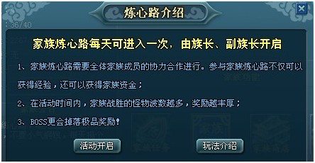 3、每日只能参加1次。当日在其他家族参与过炼心路的族长或副族长,不能再开启活动。可以任命没有参加过的族员为副族长来开启,但当日更换家族,并参与过炼心路的家族成员,不能进入炼心路;