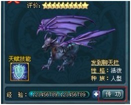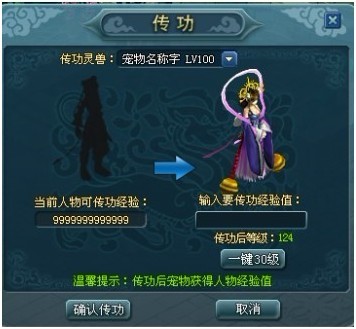 玩家可以将人物的经验转化为灵兽的经验,界面上会出现传功按钮