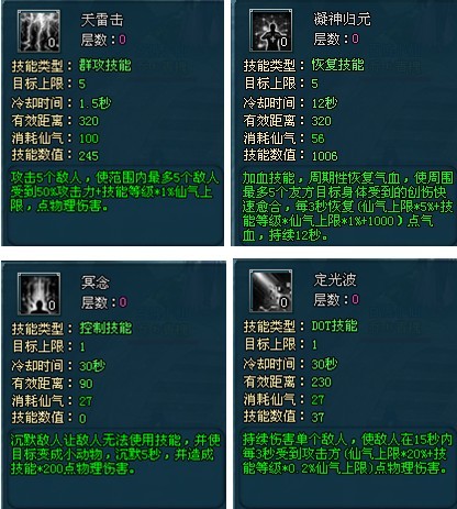灵修职业技能共有九个,而特色职业技能共有四个,分别是天雷击、凝神归元、冥念和定光波。