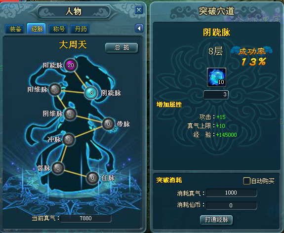 人体经脉可分为:阳跤脉,阴跤脉,阳维脉,阴维脉,带脉,冲脉,督脉,任脉。每个经脉可提升20级,经脉分为小周天和大周天,当大周天的经脉全部达到20,自动进入小周天。