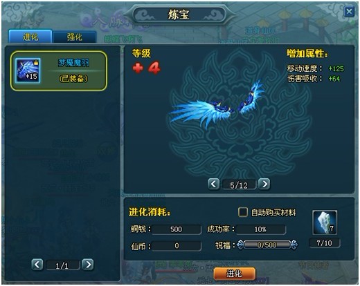 (2)翅膀强化。在百炼成仙的世界里,战斗力的提升主要靠装备、翅膀、元神、经脉。而翅膀强化是百炼后期最重要的一个提升战斗力的途径。翅膀强化可以增加翅膀对人物属性的加成,同时大幅度提升玩家的战斗力。翅膀强化需要消耗一定数量的翅膀强化石和铜钱。翅膀每强化成功一级增加的属性为:1000气血、750仙气、500闪避、250攻击、250五行攻击、伤害反弹成比例增加。这些属性不管在打怪、PK方面都是非常有用处的!