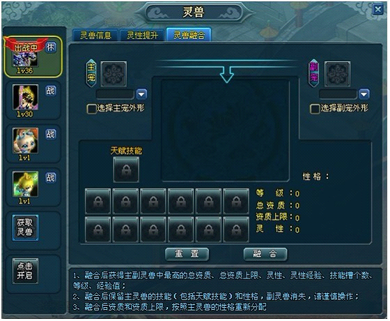 1、融合之后,主灵兽保留,副灵兽永久失去;主灵兽获得两个灵兽中最高的总资质,总资质上限,灵性、灵性经验、技能槽个数、等级、经验;