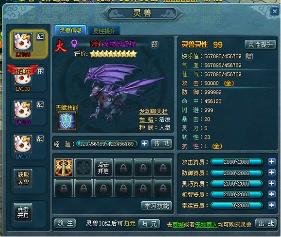 2.玩家获得的每个灵兽,初始的灵性值为0,上限100;玩家可以使用【灵性丹】或者灵兽槽内其他灵兽来对目标灵兽进行培养,提高灵性经验值;使用其他灵兽进行培养的时候,品质越高的灵兽,提升的经验值会越高;