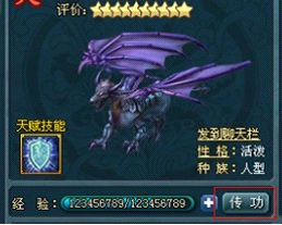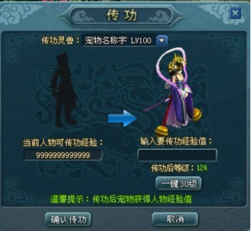 当玩家人物到达60级的时候,可以将人物的经验转化为灵兽的经验,界面上会出现传功按钮