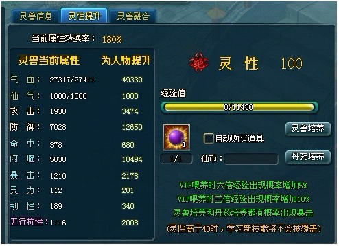 1.每个灵兽都有自己的灵性,灵性值用于将灵兽的当前属性转化为人物的属性加成;灵性越高的灵兽,属性转化率会越高。