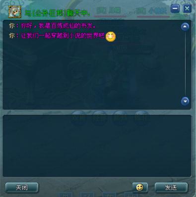 三、点击打开聊天窗口后,分别为三个区域,上侧的是双方聊天内容区域,下侧是自己的发言栏,右边侧的是玩家的人物形象。