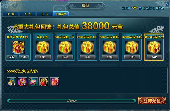为广大玩家更容易进行游戏,官方特别准备了6个充值大奖包,只要充值达到指定金额即可免费获得相应礼包,每个礼包只可以领取一次。