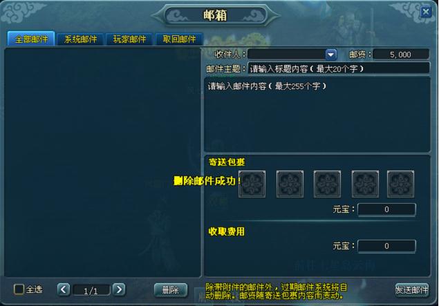 您可以将邮箱中的邮件删除,每次删除邮件时,都会有对话框提示确认,如邮件中含有游戏币或附带物品,您必须提取游戏币或物品后,才可删除邮件。