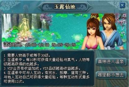 玩家的休闲盛地,玩家可以在温泉里得到很高的在线经验和真气;