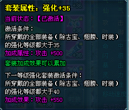 当玩家装备齐13件装备(除古宝、翅膀、时装)都强化到一定等级以上,可以激活对应的强化套装属性,获得额外的属性加成。