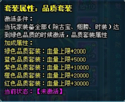 当玩家装备齐13件装备(除古宝、翅膀、时装)都品质都在绿色以上,可以激活对应的品质套装属性,获得额外的属性加成。