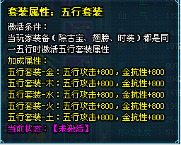 当玩家装备齐13件装备(除古宝、翅膀、时装)都是同一五行属性时,可以激活对应的五行套装,获得额外的属性加成。