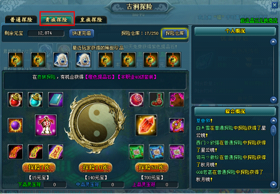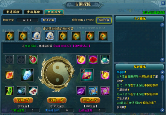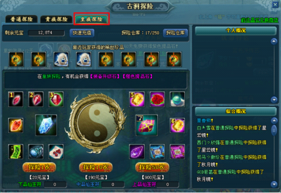 获得物品:高级气血包,高级仙气包,修炼秘籍,上品增益符,各种灵兽技能书,灵性丹,极品经验丹,上品、中品、下品晶石卷轴(打开后获得1000晶石,用于商城晶石区内兑换各种稀有商品),高级铜钱符,橙色提品石,40级本职业探险套装。