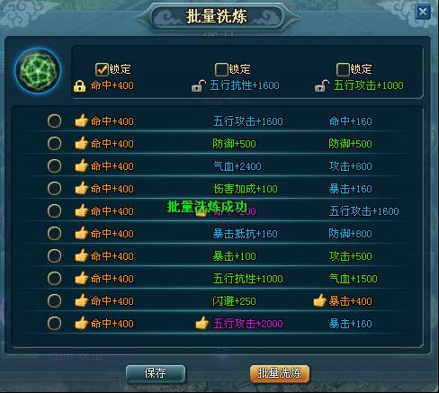 2)批量洗炼:可以同时进行10次洗炼,批量洗炼完毕后,会出现10个组合属性,可以选择需要的属性保存;