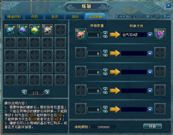 可将不同的镶嵌石转换为同等级的其他属性的镶嵌石,转换镶嵌石属性需要消耗一定数量的铜钱。