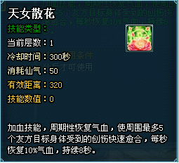 1.特殊技能:仙女散花—群体持续回血buff,有效距离和群攻一样,每秒恢复10%,持续8s,CD5分钟;