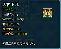 1.特殊技能:天神下凡—无敌10s,免疫任何伤害,CD5分钟;