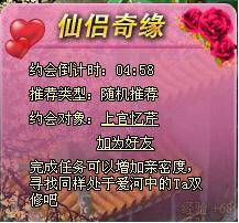 人物达到38级后,每天可以从【幽州城】-【红娘】处接取仙侣奇缘任务,接取了任务的玩家可以向另一名异性玩家发出邀请。玩家每天可以邀请一名玩家进行仙侣奇缘,还可以接受两次仙侣奇缘邀请。