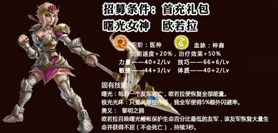 首先来说奥义,黎明之拥这个技能前期堪称无解,在排阵适当的情况下,经常出现奇迹性胜利。当然如果是PK的话另一方肯定蛋疼无语。三秒不屈就是三秒内在该状态下不会死亡并且同时恢复大量的血。