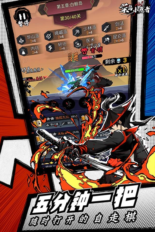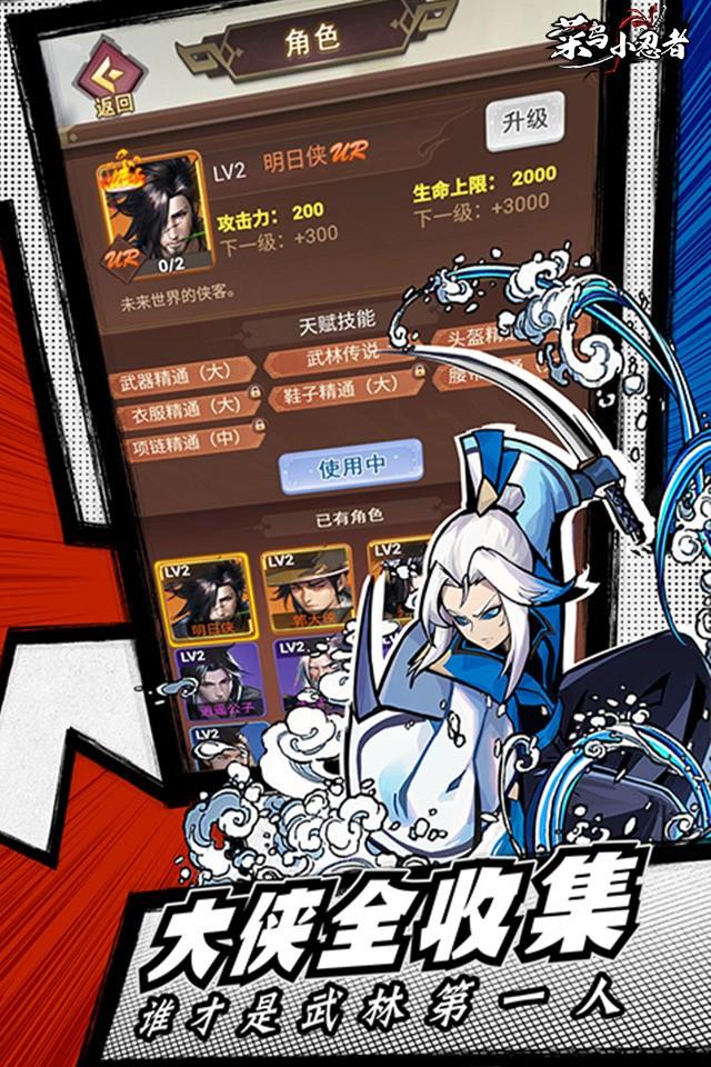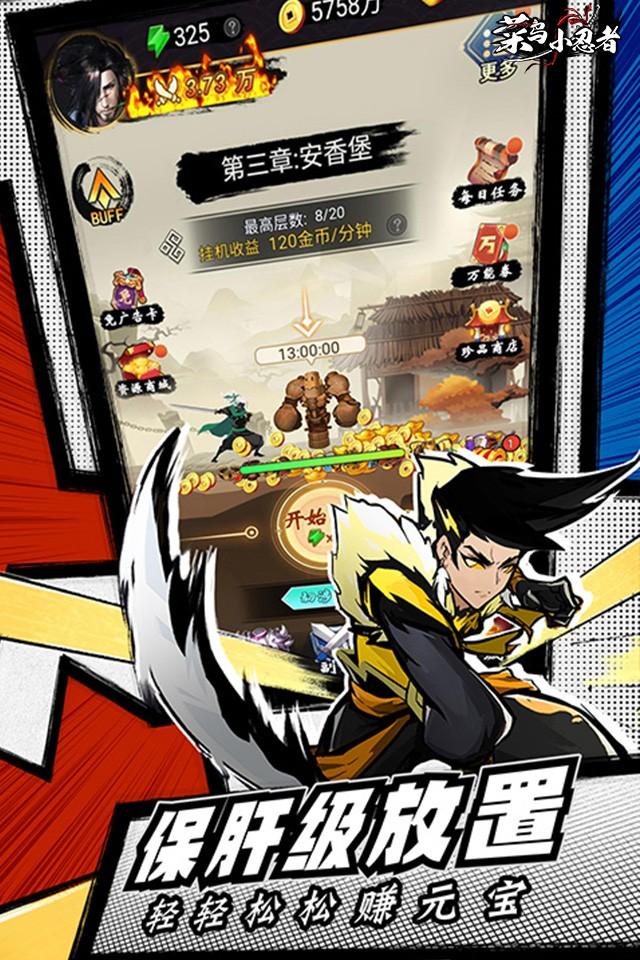 《菜鸟小忍者》是一个roguelike自走棋游戏,你将扮演一个初出茅庐的小菜鸟,义无反顾地走进刀光剑影的江湖,不断与各路高手一决高下。碎片化的自走棋操作,武功秘籍随心组合,随时随地拿出手机就能凑一把羁绊就能玩;轻松保肝的放置养成,每次上线都有福利领取。