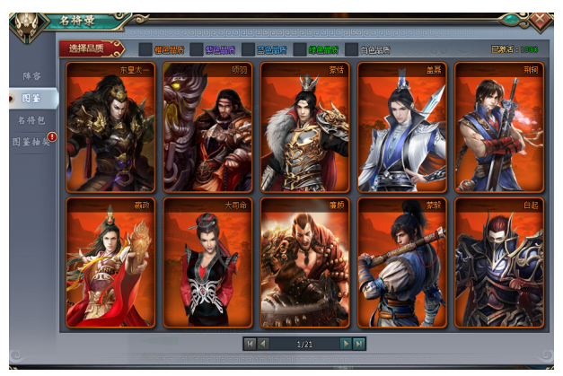 Ø 图鉴界面显示游戏所有的名将;排序按照:橙、紫、蓝、绿排序进行排序
