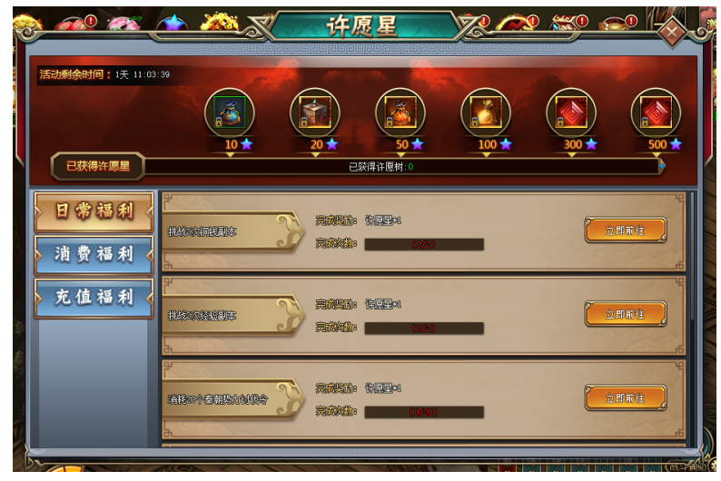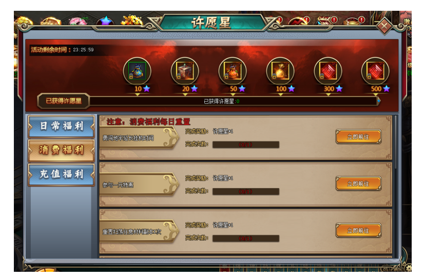 1. 活动期间,玩家可通过完成目标任务或者充值,获取许愿星