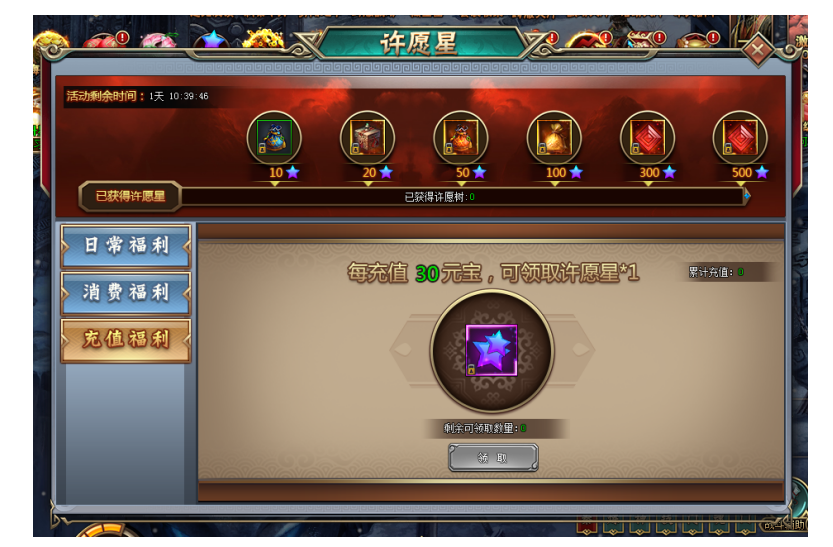 1. 活动期间,每充值30元宝,可领取许愿星*1