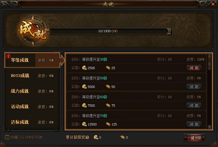 成就系统分为:“等级成就”、“BOSS成就”、“战力成就”、“活动成就”、“达标成就”五个部分。